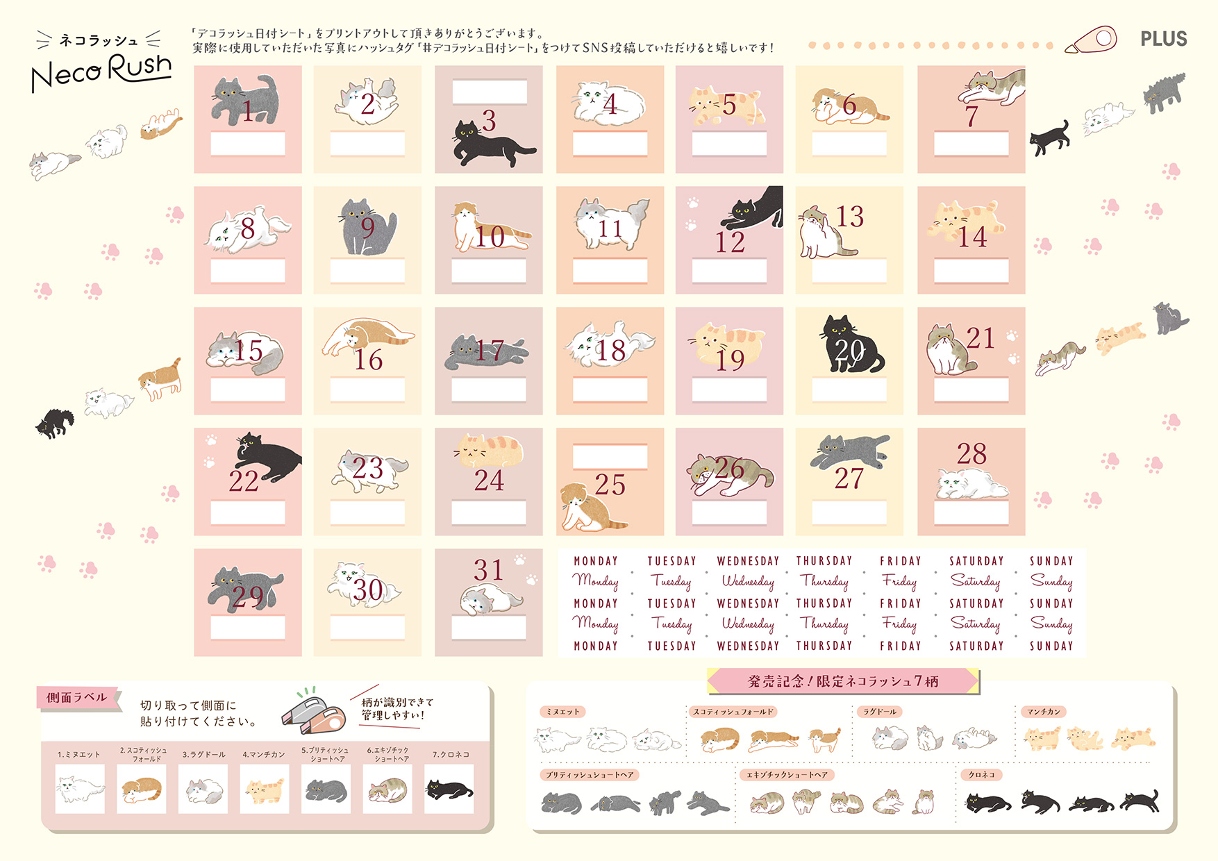 ネコラッシュの発売を記念して、「デコラッシュ日付シート」を配信中。デコラッシュと一緒に使ってお楽しみください。